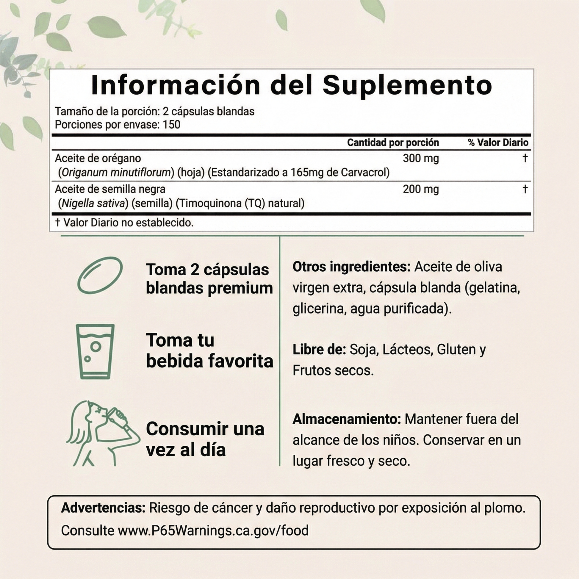 Toma 2 cápsulas blandas al día. Para mejores resultados, tómalas antes de dormir, 2 horas después de cenar. No quieres mezclar el aceite con la comida que estás digiriendo. Puedes tomarlas juntas o separadas según tu preferencia.